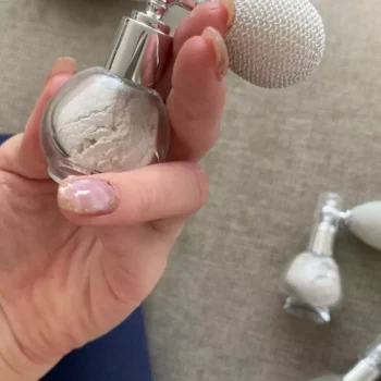 This product is GREAT! It offers a soft, white, sparkly shine that can be built upon. It comes in a charming, old-fashioned squeeze puff bottle that adds to its allure.