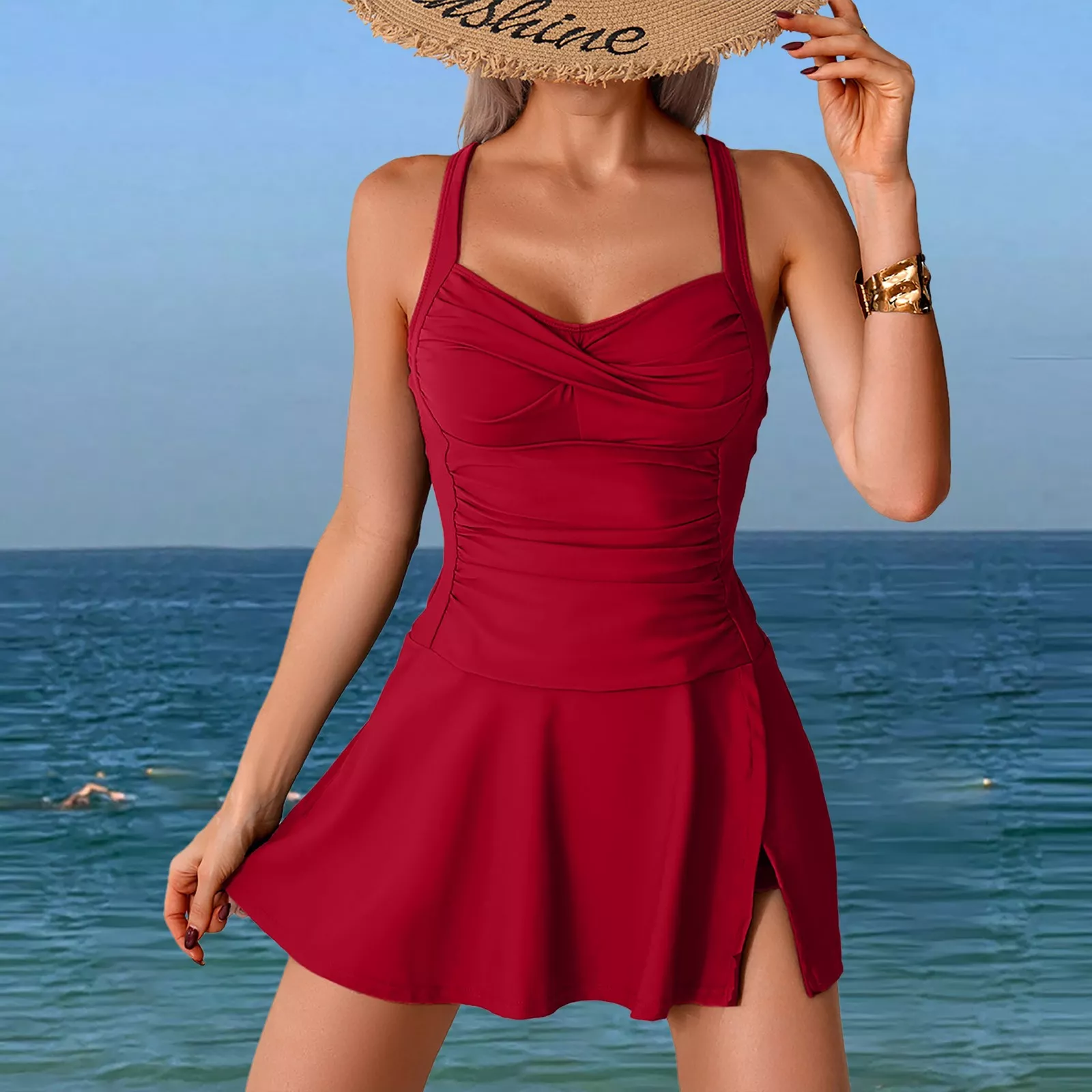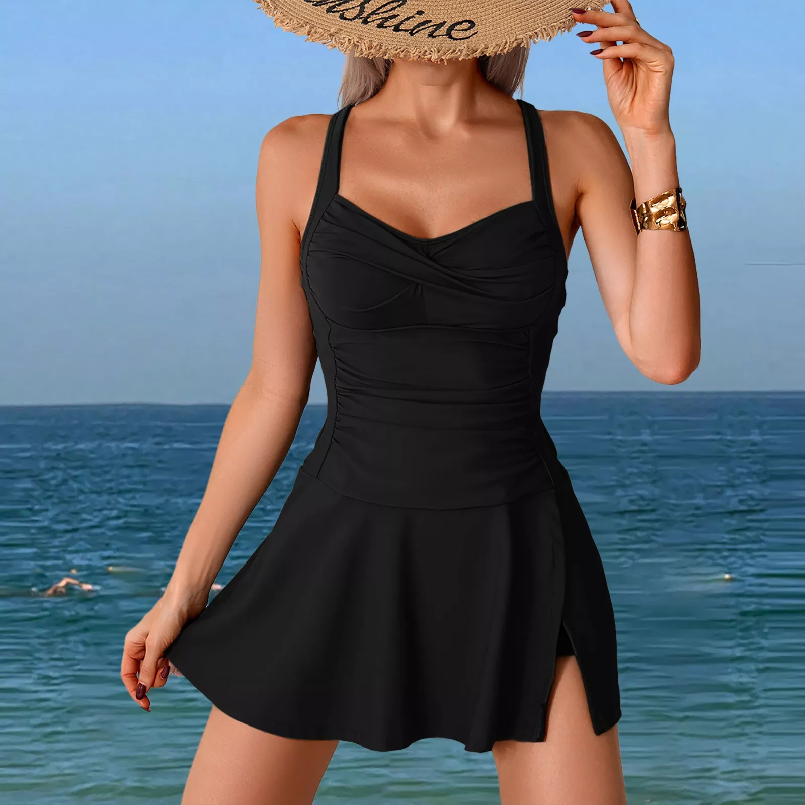Turn heads poolside or on the beach in this stunning Women’s Two-Piece Slit Swimdress with Boxer Shorts. Designed to flatter every figure, this swimsuit blends sporty comfort with flirty style, offering a unique twist on the classic bikini. With its sleek, sleeveless slit skirt and matching high-waisted boxer shorts, this set brings out your inner beach goddess while keeping you supported and stylish. Whether you’re lounging, swimming, or playing volleyball in the sand, this versatile swim set keeps up with every move.